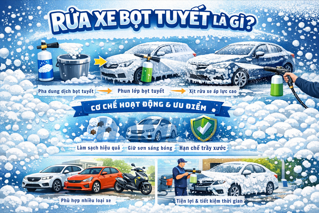 Rửa xe bọt tuyết chính là phương pháp làm sạch xe ô tô tối ưu, vừa hiện đại, vừa an toàn và hiệu quả. Từ việc chọn mua xà bông rửa xe bọt tuyết phù hợp, trang bị dụng cụ đúng chuẩn, đến kỹ thuật pha chế và thực hiện, đều góp phần quyết định độ sáng bóng và bền đẹp của chiếc xe của bạn