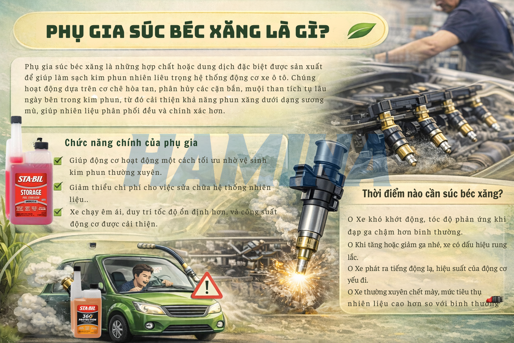 Phụ gia súc béc xăng là những hợp chất hoặc dung dịch đặc biệt được sản xuất để giúp làm sạch kim phun nhiên liệu trong hệ thống động cơ xe ô tô. Chúng hoạt động dựa trên cơ chế hòa tan, phân hủy các cặn bẩn, muội than tích tụ lâu ngày bên trong kim phun, từ đó cải thiện khả năng phun xăng dưới dạng sương mù, giúp nhiên liệu phân phối đều và chính xác hơn.