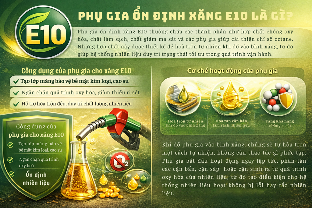 Trong xu hướng hiện nay, phụ gia ổn định xăng E10 đã trở thành "vật bất ly thân" của các chủ xe máy muốn bảo vệ và nâng cao hiệu quả vận hành. Dù là dạng dung dịch hóa học hay hợp chất đặc biệt, chúng đều có chung mục tiêu cải thiện chất lượng nhiên liệu và bảo vệ hệ thống động cơ. Phần này sẽ giúp bạn có cái nhìn rõ hơn về thành phần, công dụng và cơ chế hoạt động của phụ gia.