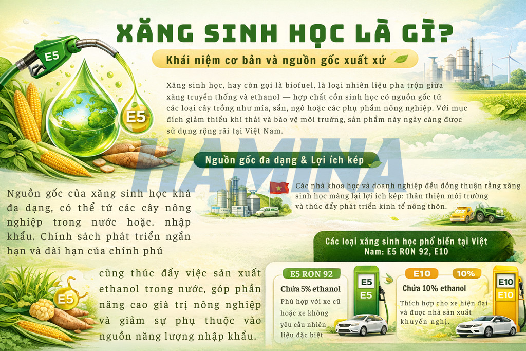 Xăng sinh học, hay còn gọi là biofuel, là loại nhiên liệu pha trộn giữa xăng truyền thống và ethanol – hợp chất cồn sinh học có nguồn gốc từ các loại cây trồng như mía, sắn, ngô hoặc các phụ phẩm nông nghiệp. Với mục đích giảm thiểu khí thải và bảo vệ môi trường, sản phẩm này ngày càng được sử dụng rộng rãi tại Việt Nam.